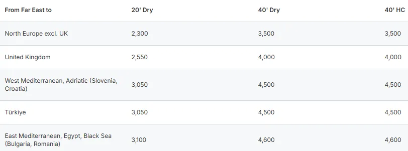 此外,赫伯罗特也同步上调远东至北欧及地中海航线的FAK费率。新价格自2026年5月15日起执行,适用于20尺、40尺及高柜箱型,包括干箱与冷藏箱,显示出欧洲方向运价整体走强趋势。
