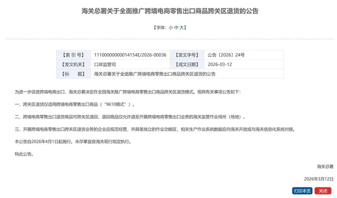 海关总署发布公告,自2026年4月1日起,在全国范围内正式推广跨境电商零售出口商品(监管代码9610)的跨关区退货监管模式。