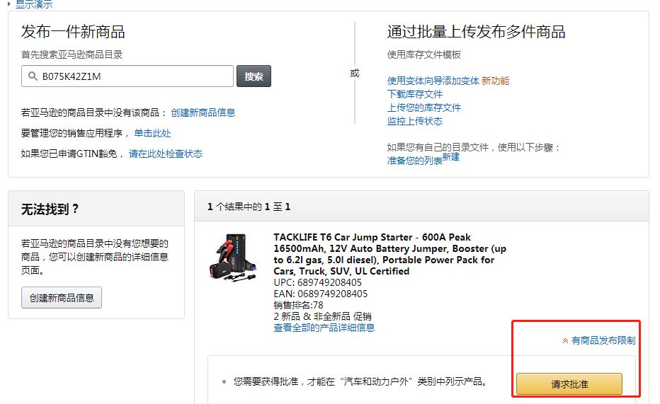 如果该商品需要类目审核,搜索出该ASIN码商品的下方会有“商品发布限制”或“请求批准”字眼。