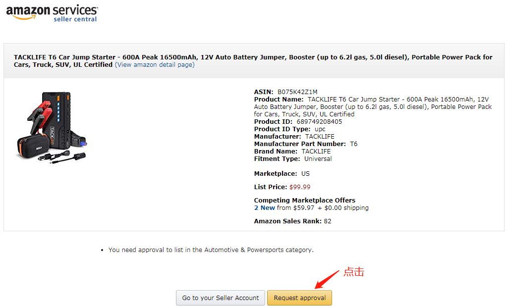 3. 前台搜索产品,点击进入listing页面,点sell on Amazon跟卖按钮,再点击Request approval,会自动跳转到下一个的页面,然后下拉到底部,点“申请批准”按钮即可提交类目审核.