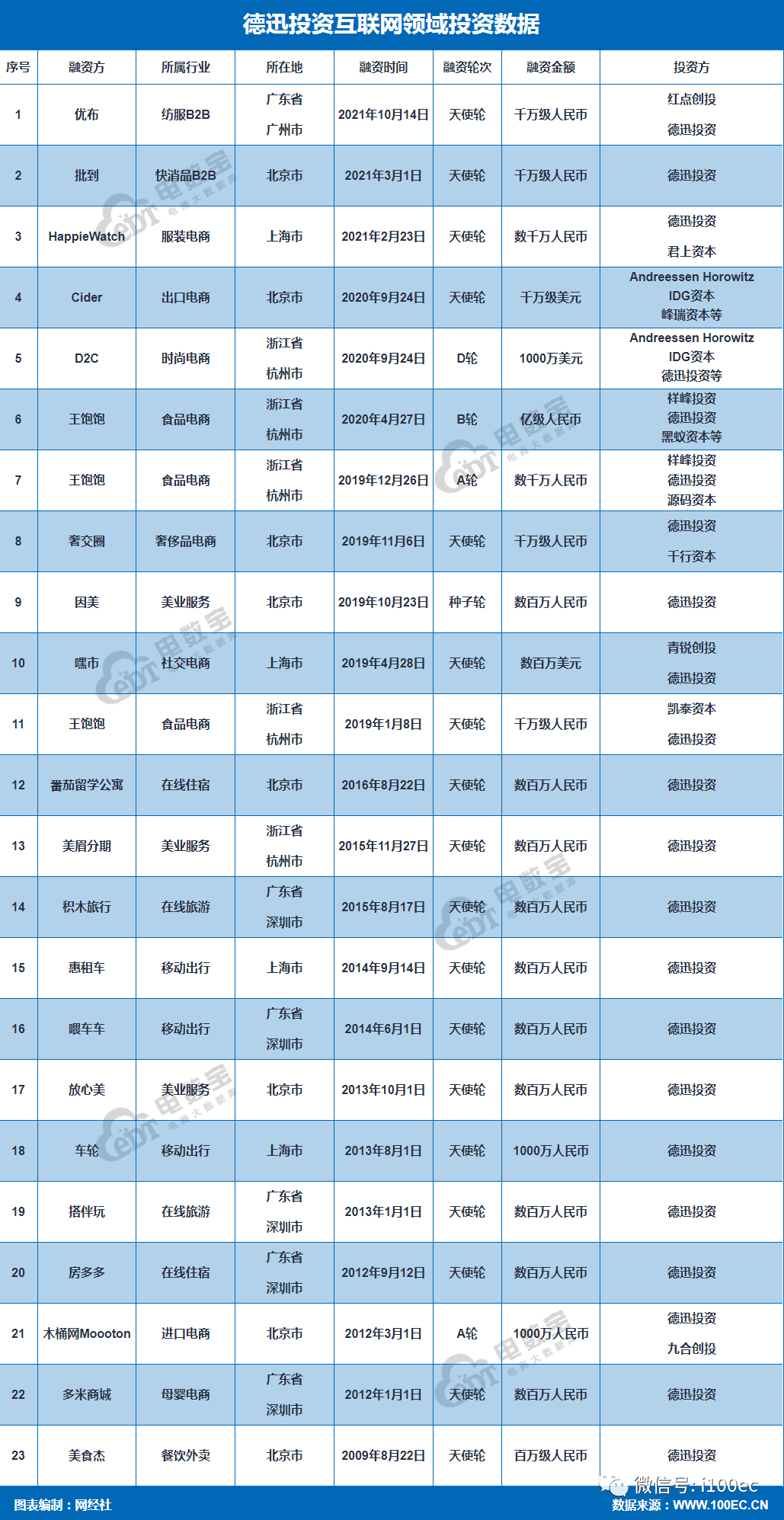 据网经社“电数宝”(DATA.100EC.CN)大数据库显示,2009年8月至2021年10月,德迅投资累计参与了23起互联网领域的投资,涉及公司分别为:优布、批到、HappieWatch、Cider、D2C、王饱饱、奢交圈、因美、嘿市、番茄留学公寓、美眉分期、积木旅行、惠租车、喂车车、放心美、车轮、搭伴玩、房多多、木桶网Moooton、多米商城、美食杰。