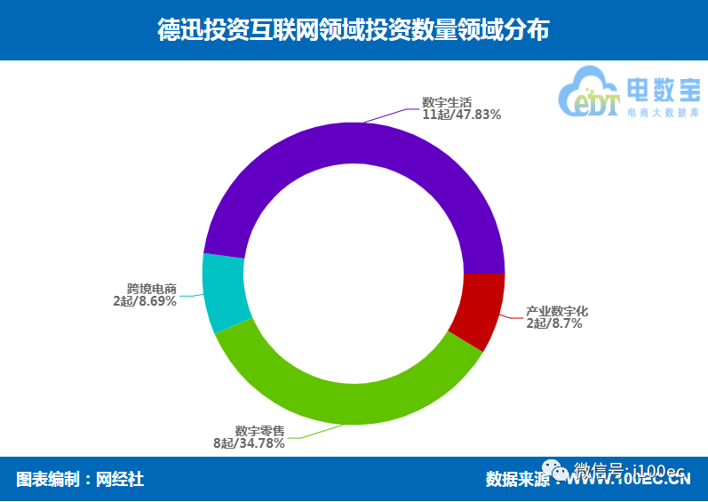 在互联网领域中,德迅投资最青睐的是数字生活,共11起,占比47.83%;其次是数字零售,共8起;产业数字化和跨境电商各2起。