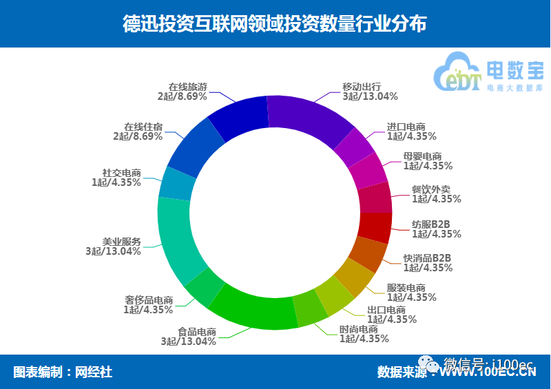 在行业分布上,德迅投资广泛布局,涉及了15个行业。其中,美业服务、食品电商和移动出行获投次数最多,各3起;其次,在线旅游、在线住宿,各2起;社交电商、奢侈品电商、时尚电商、出口电商、服装电商、快消品、纺服、餐饮外卖、母婴电商和进口电商,各1起。