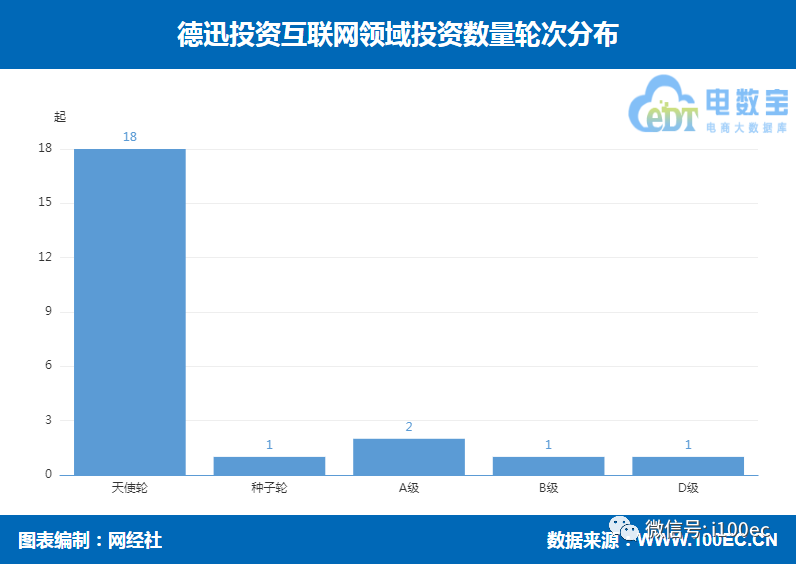 数据统计发现,在德迅投资的投资中,投资次数最多的是天使轮,为18起;其次是A级,为2起;种子轮、B级和D级各1起。
