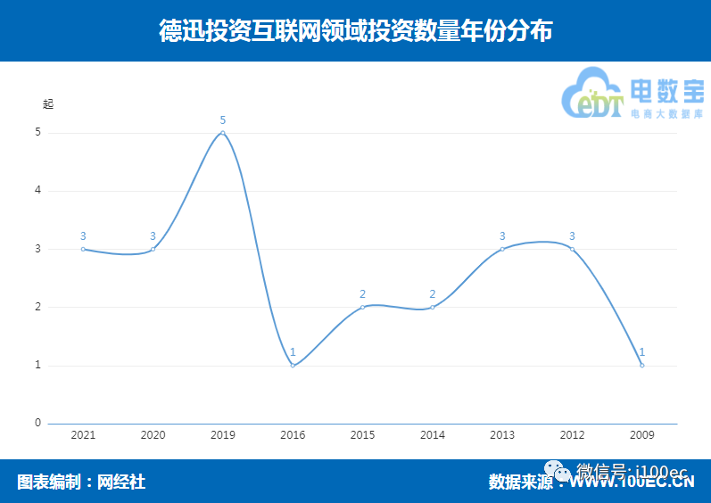 在年份分布上,德迅投资2019年投资次数最多,为5起;其次是2021年、2020年、2013年和2012年,各3起;2015年和2014年各2起;2016年和2009年各1起。