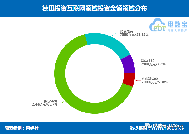 在所有领域中,德迅投资偏爱数字零售领域,投资金额为2.44亿元,占比65.7%;其次是跨境电商领域,为7850万元;数字生活领域为2900万元;产业数字化领域为2000万元。