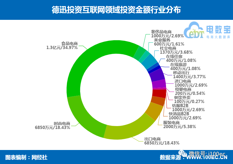 从投资的行业分析,德迅投资超三成投资在食品电商,金额为1.3亿元;其次是时尚电商和出口电商,各为6850万元;社区团购为5.48亿元;服装电商为2000万元;移动出行为1400万元;社交电商为1370万元;奢侈品电商、进口电商、纺服B2B、快消品B2B,各1000万元;美业服务为600万元;在线住宿和在线旅游各400万元;母婴电商为200万元。