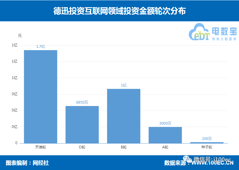 数据显示,在德迅投资的投资中,投资金额最多的是天使轮,投资金额为1.7亿元;其次是B轮,投资金额为1亿元;D轮投资金额为6850万元;A轮投资金额为3000万元;种子轮为200万元。