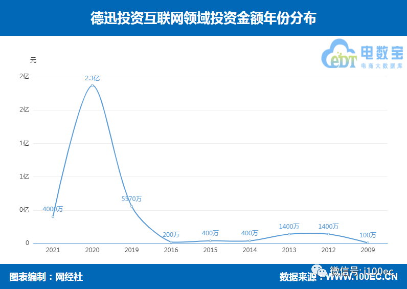 在投资金额年份中,德迅投资2020年投资金额最多,为2.3亿元;其次是2019年,5570万元;2021年为4000万元;2013年和2012年各1400万元;2015年和2014年各400万元;2016年为200万元;2009年为100万元。