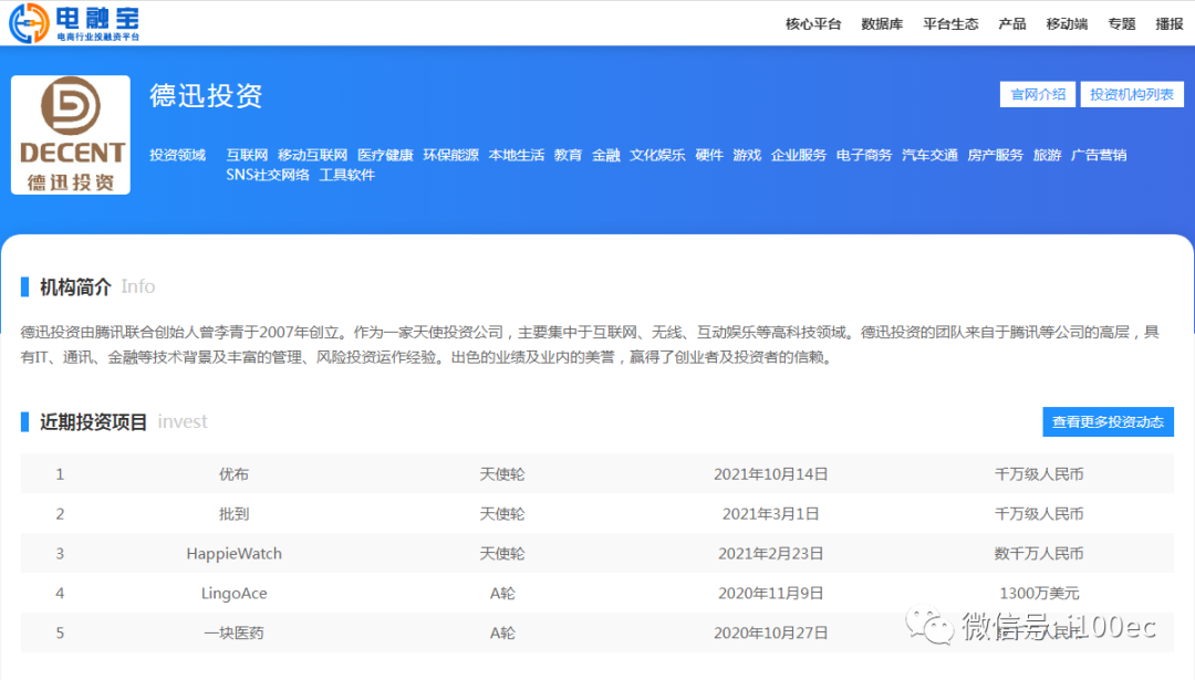 据网经社“电融宝”投资方库显示,德迅投资由腾讯联合创始人曾李青于2007年创立。作为一家天使投资公司,主要集中于互联网、无线、互动娱乐等高科技领域。德迅投资的团队来自于腾讯等公司的高层,具有IT、通讯、金融等技术背景及丰富的管理、风险投资运作经验。出色的业绩及业内的美誉,赢得了创业者及投资者的信赖。