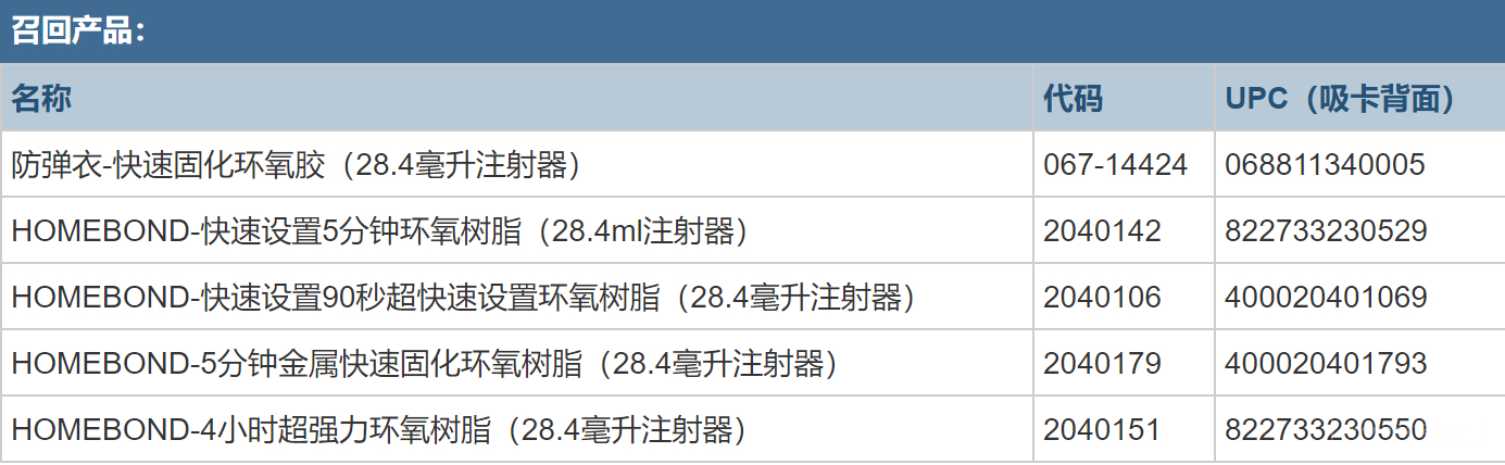 除此之外以下带有红色,黄色,蓝色和/或灰色包装的28.4毫升双筒注射器的粘合剂也在召回名单中: