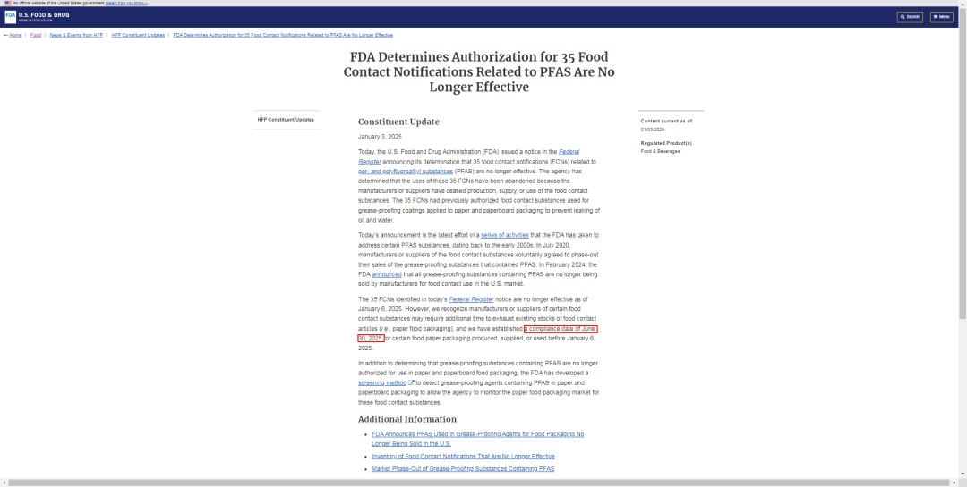 35项与PFAS相关的食品接触物质通报(FCNs)已于2025年1月6日正式失去效力。