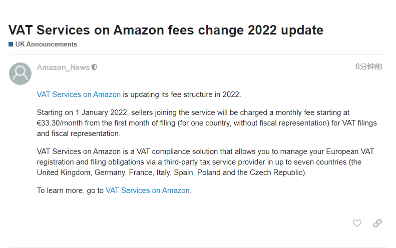 近期亚马逊在美国卖家中心的公告板上发布了一则公告,通知在全球销售的卖家,自2022年1月1日起,加入亚马逊增值税服务将从提交的第一个月开始收取33.30欧元月费,之前是提交后前6个月免费。