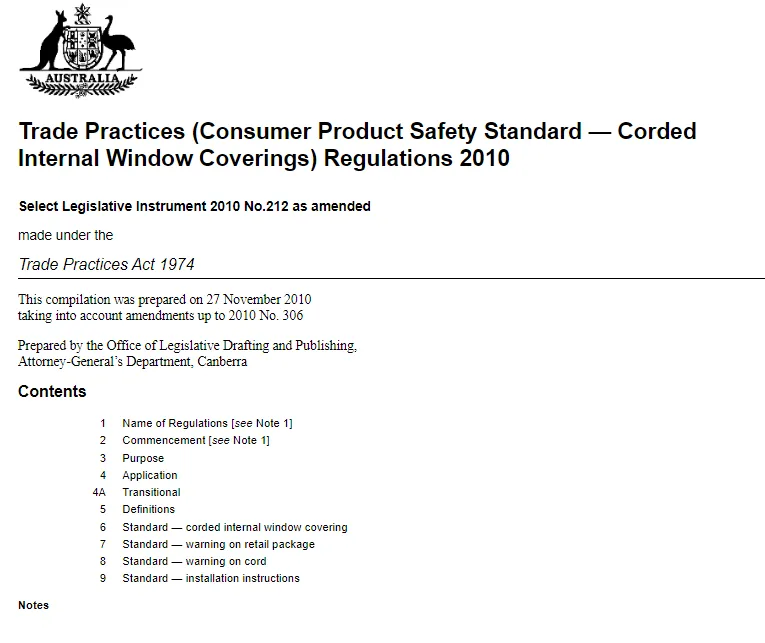 Competition and Consumer (Corded Internal Window Coverings) Safety Standard 2014 & Trade Practices (Consumer Product Safety Standard—— Corded Internal Window Coverings) Regulations 2010. 2014竞争和消费者(有室内窗帘)安全标准和2010年贸易例(消费者产品安全标准--有绳室内窗帘)规定