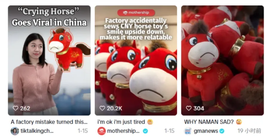 在TikTok上搜索“哭哭马”,可以看到大量“I'm ok i'm just tired”、“WHY NAMAN SAD?”等玩梗内容,给原本平平无奇的玩偶注入了“活人感”。