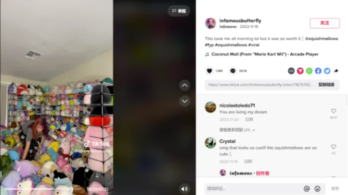 其中,一款名为Squishmallows毛绒玩具十分擅长与垂直领域红人进行合作,例如,玩具收藏家、动漫爱好家等,利用这些垂直领域红人的影响力,精准触达目标用户,并且达到十分显著的引流效果。