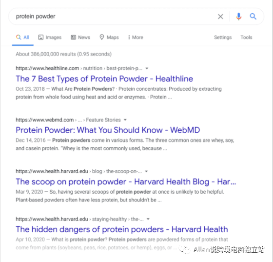 例如,取一个关键词:“蛋白粉”,搜索该术语的人可能想要购买一些蛋白质。或者他们想了解关于蛋白粉的更多信息。根据谷歌关于那个关键词的第一页,大多数搜索“蛋白粉”的人都是在寻找信息。