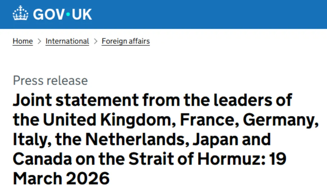 3月19日,七国(英、法、德、意、荷、日、加)领导人在英国政府官网发布联合声明,对近期霍尔木兹海峡局势作出最强烈政治回应。声明严厉谴责伊朗针对商船、油气设施的袭击及对海峡的封锁行为,明确指出此举严重违反《联合国海洋法公约》,强调航行自由是不可逾越的国际法底线。