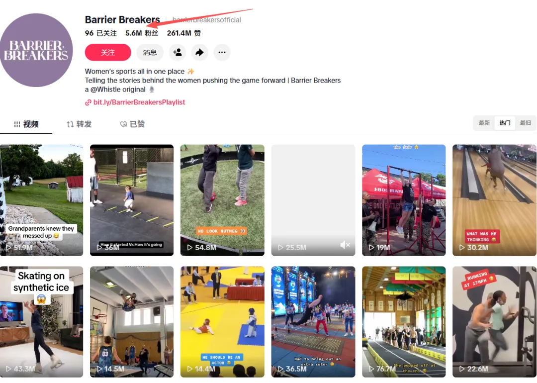 再看红人: barrierbreakersofficial 的内容。这个账号拥有500万粉丝,长期聚焦运动科技垂类,受众高度集中在训练人群。