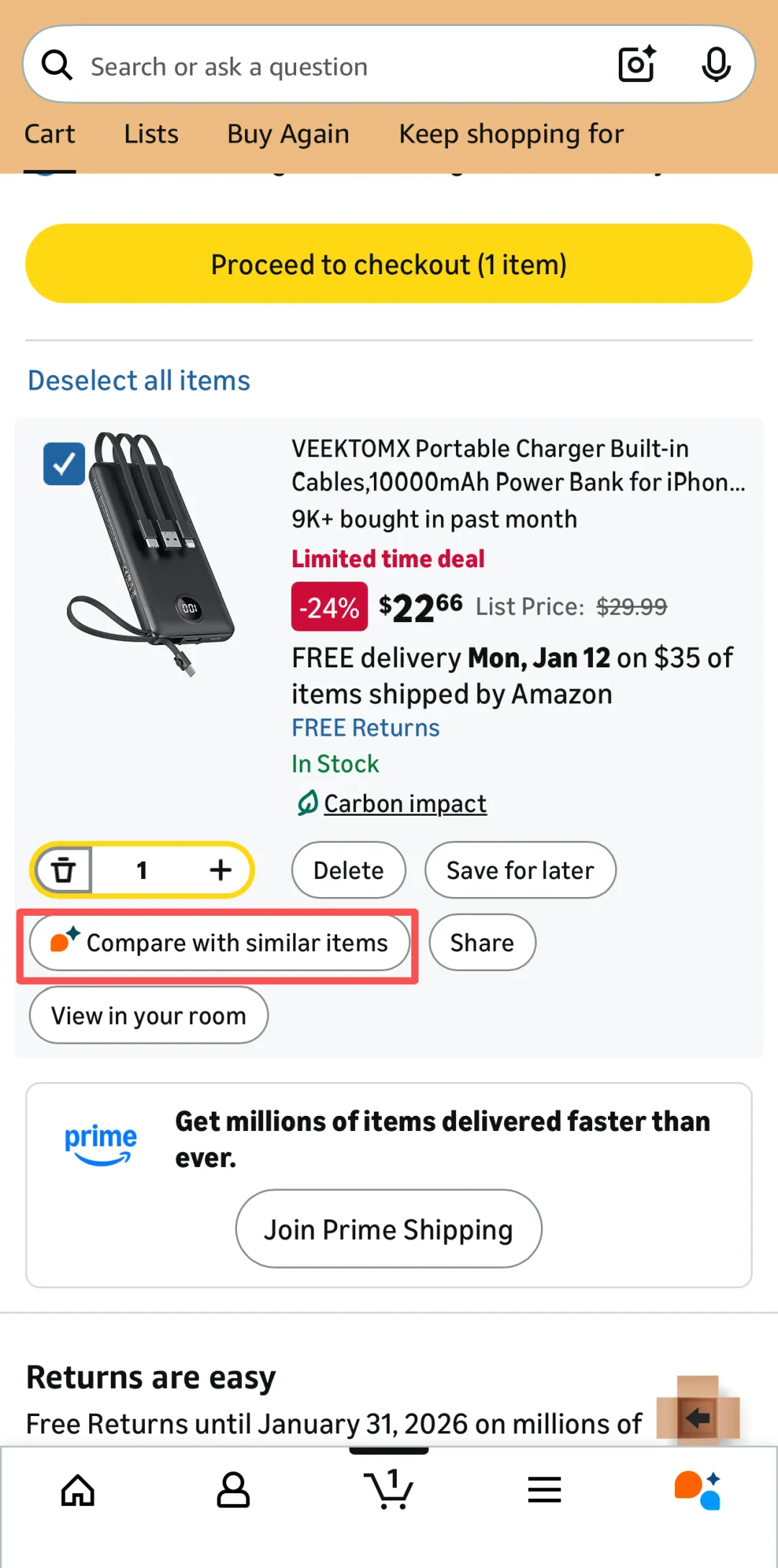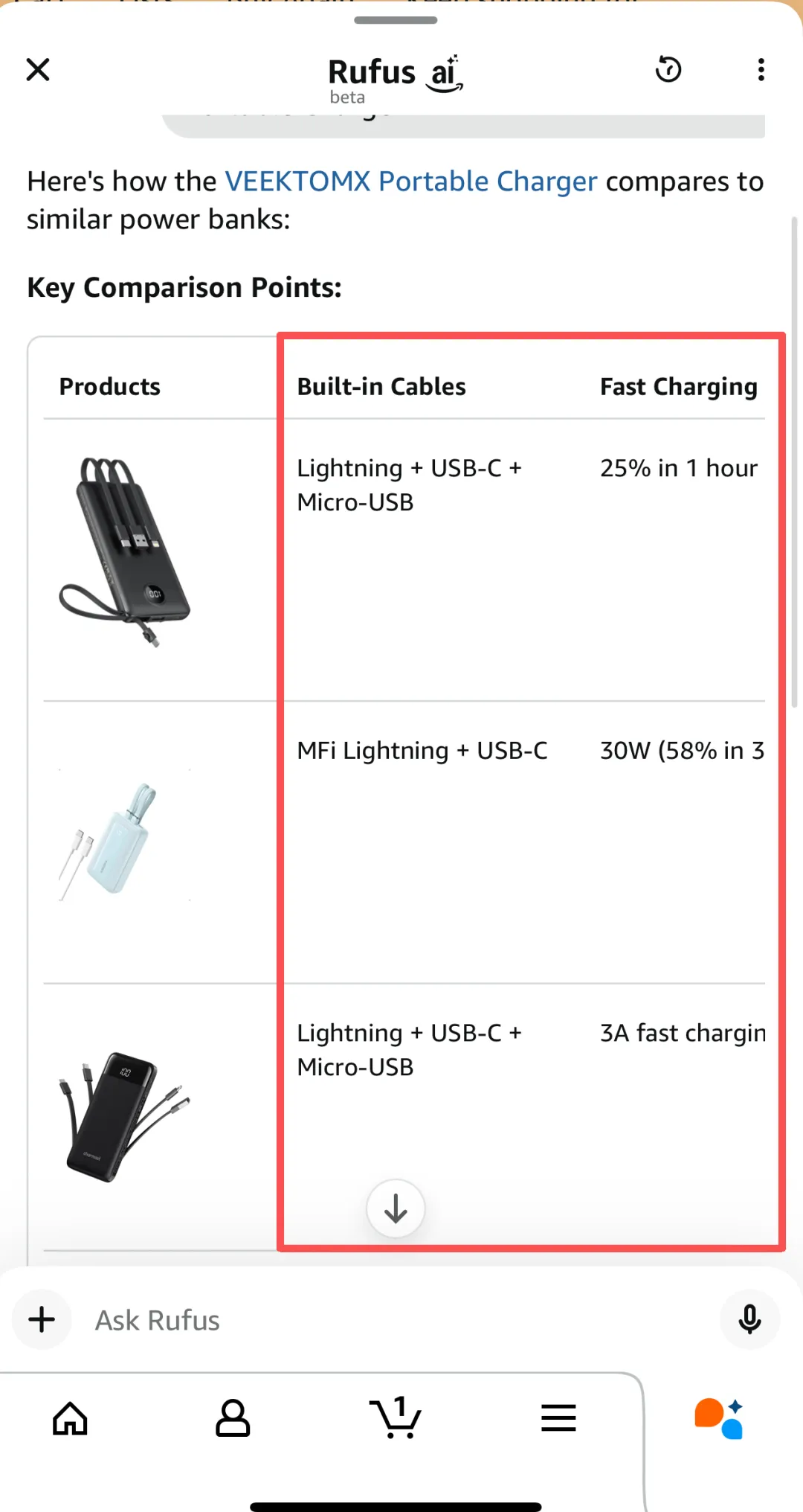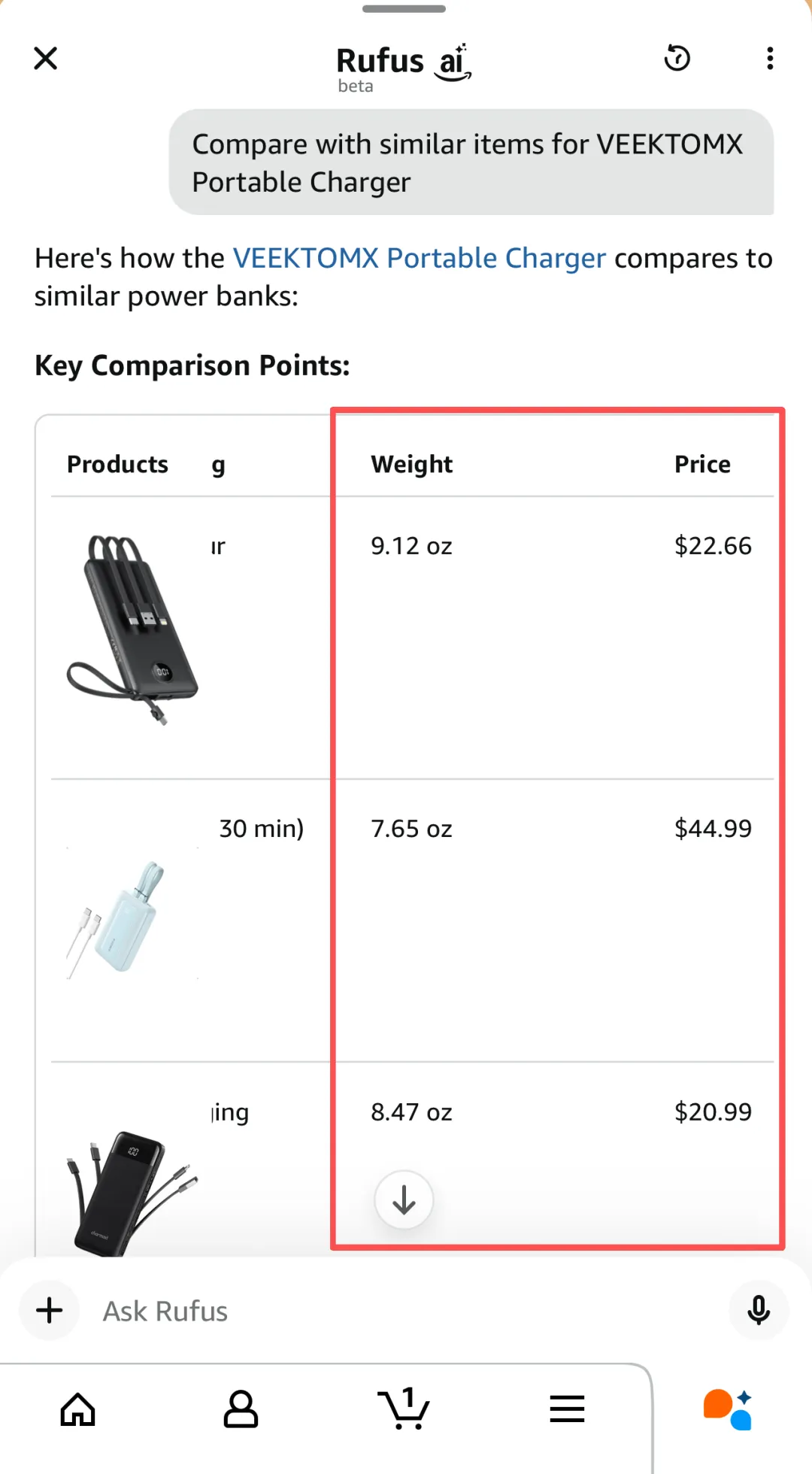 当买家把某款充电宝加入购物车后,点击Compare with similar items,Rufus会自动拉出一组高度相似的竞品,并从几个固定维度进行对比: