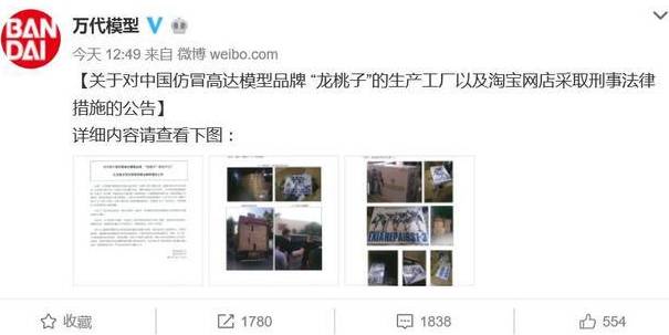 近日,日本玩具厂商万代模型控告了一家中国厂商,万代模型发公告称,针对仿冒高达模型品牌“龙桃子”在广东汕头大量制造、销售仿冒产品,以侵犯著作权罪为由,向警方提起了刑事控告,要求追究相关方刑事责任。