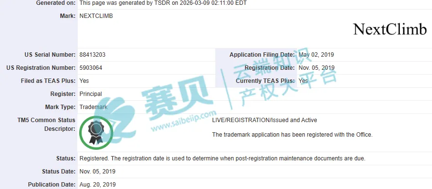 商标名称:NEXTCLIMB(标准字符商标)