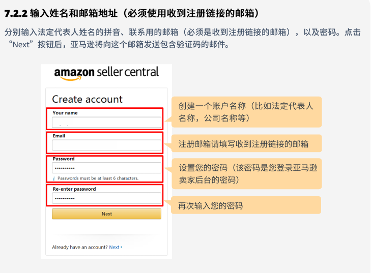 分别输入您姓名的拼音(建议填写法定代表人姓名的拼音)、联系用的邮箱,以及密码。点击“下一步”按钮后,亚马逊将向这个邮箱发送包含验证码的邮件。
