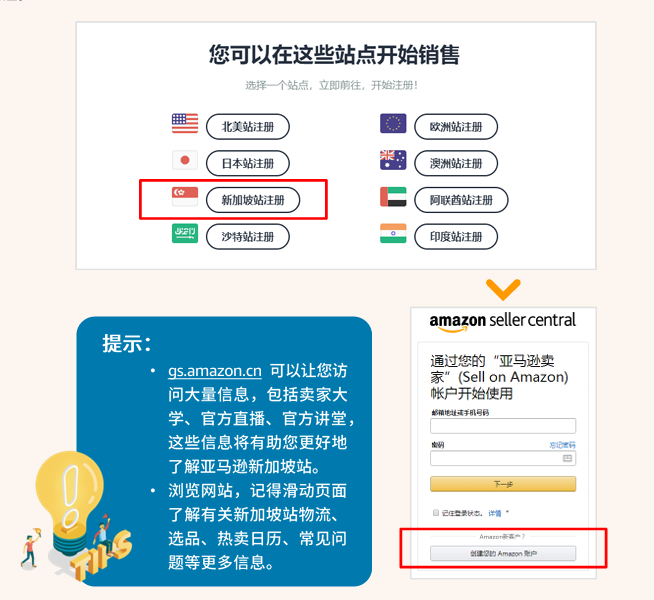 如果您是自注册的新卖家,未开通任何一个站点,请您打开 gs.amazon.cn,点击右上角的“前往站点注册”,然后选择“新加坡站注册”,在新出现的画面中,点击下方的“创建您的 Amazon 账户’按钮。