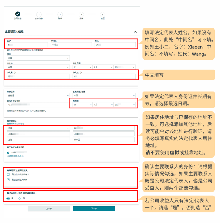 5)确认主要联系人的身份,请根据实际情况勾选“是企业的受益所有人”和“是企业的法定代表人勾选框(如果主要联系人是公司法定代表人,同时也是公司受益人,则两个都要勾选);