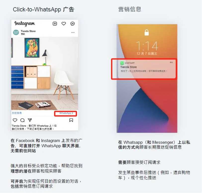 Facebook和Instagram是出海企业进行广告投放的主要平台,如何让广告产生直接的效益呢?Click to WhatsApp 广告为企业提供了一种高效且便捷的营销方式。在Facebook或Instagram广告中嵌入 WhatsApp 图标或按钮,用户只需点击即可直接与企业展开对话。这种方式大大降低了用户与企业沟通的门槛,提高了用户的参与度,而且点击按钮的用户也是对产品或服务感兴趣的“优质”用户,有利于进一步的转化。