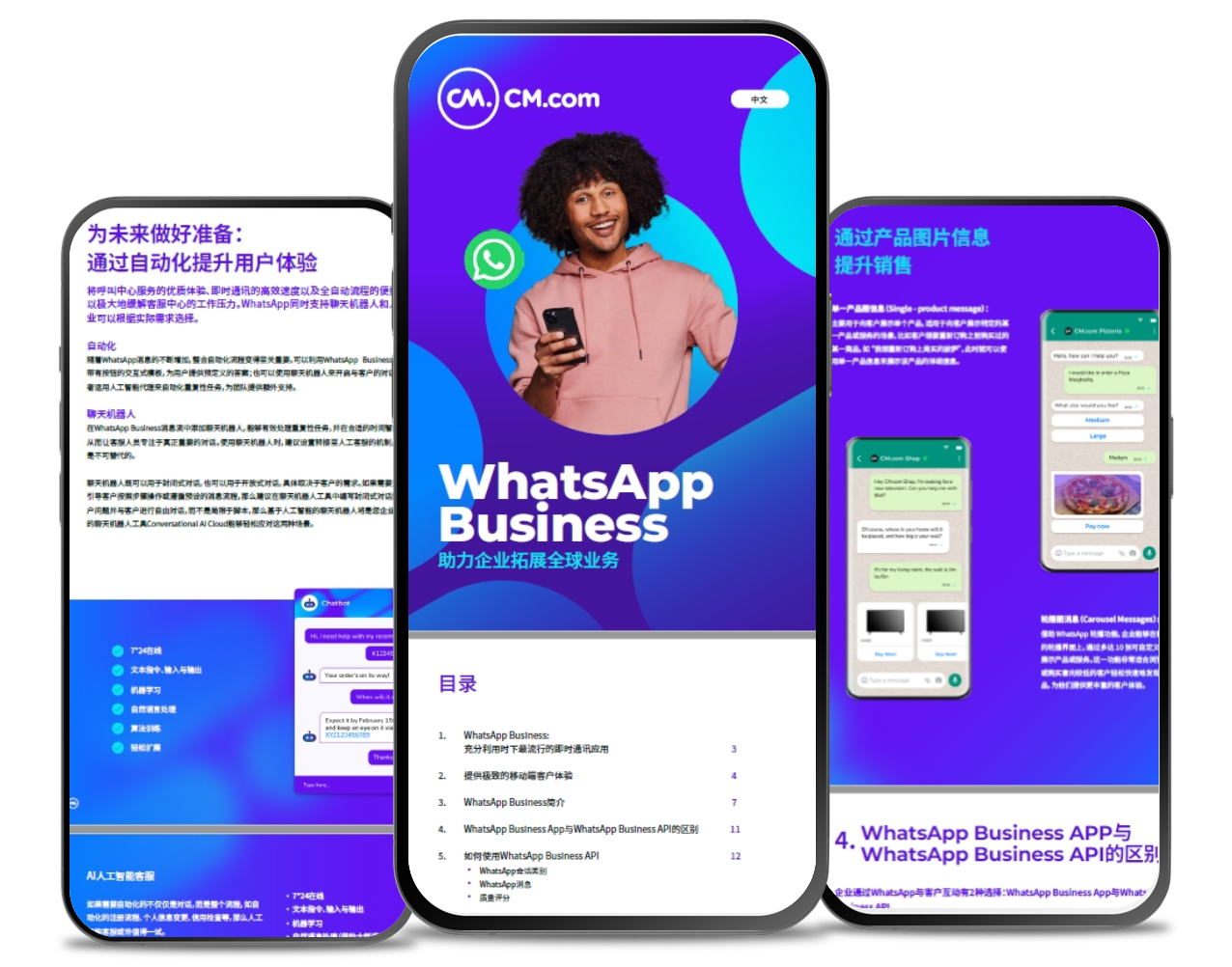 WhatsApp官方认证的WhatsApp Business API服务商CM.com,自2019年起便为全球企业提供接入WhatsApp Business API的解决方案,在中国,CM.com以帮助各类出海企业成功使用WhatsApp与全球用户沟通互动。CM.com拥有丰富的经验,能够帮助企业高效利用WhatsApp Business API与全球用户建立联系、精细化运营。