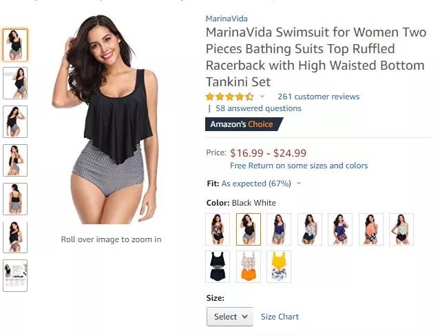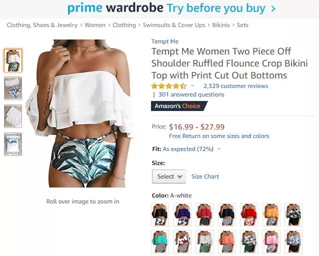 这件泳衣在亚马逊上获得了2329条Review,其主要卖点是荷叶边和一字领的讨喜设计,这较传统比基尼而言多了一分修饰和韵味。同样,这款泳衣也推出了多达21种的搭配花色以供选择。