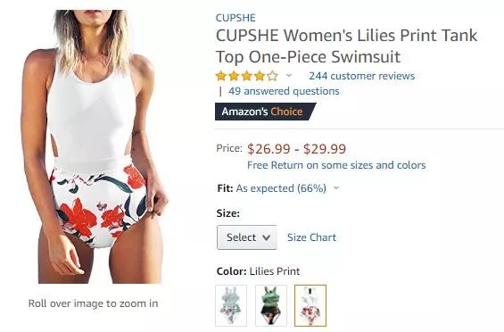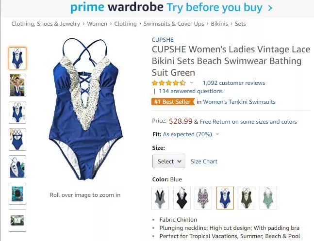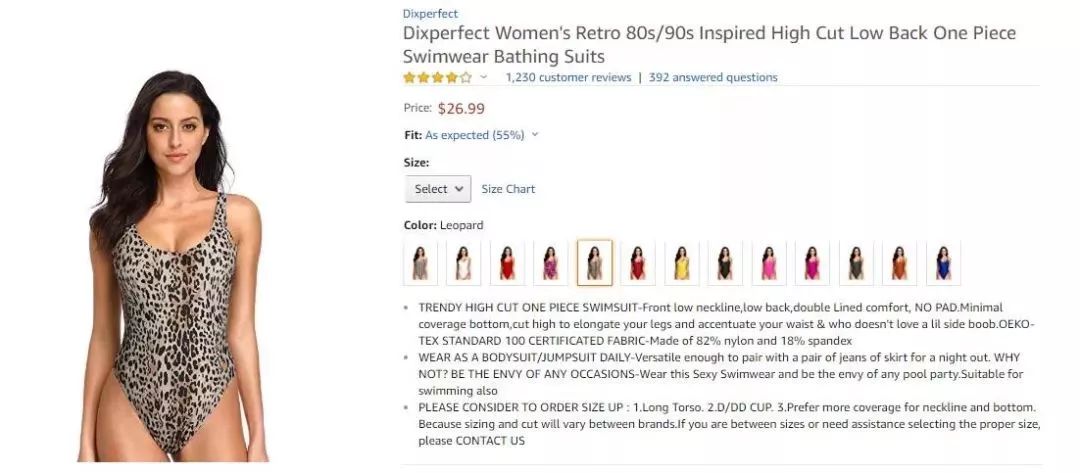 这款评级4星的泳衣在亚马逊上获得了1229条review,其完美地融合了动物印花和性感剪裁。此外考虑到一些消费者对动物印花无感,因此这款产品还推出了纯色款式。