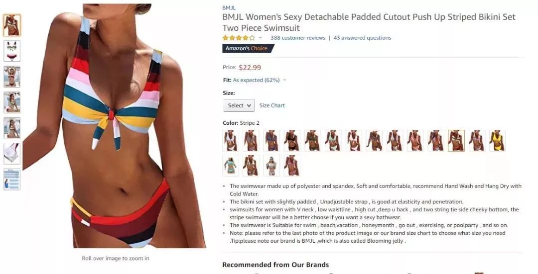 成功的产品离不开所针对的利基市场和特定人群。这款条纹比基尼的肩带特地针对胸部丰满的人群进行价款,此外还配备了可拆卸护垫。目前这种产品共有17种可选的颜色或花色,可以满足不同风格的需求。