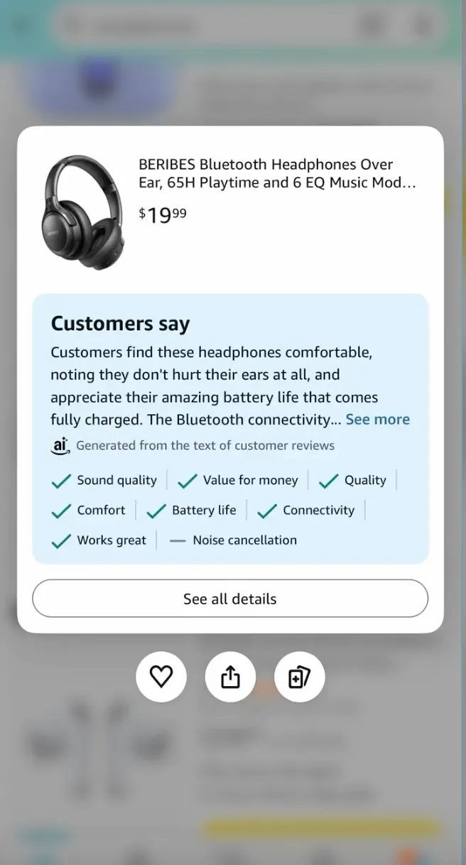亚马逊在前台用户体验上再次引入重要变化,当买家在搜索结果页对任意商品进行长按或停留时,系统会直接展示一段 由 AI 自动生成的评论摘要。