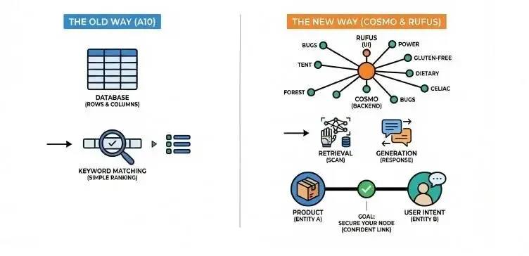 传统亚马逊 A9 搜索和现在的 Rufus AI 推荐,完全是两套不一样的逻辑。老版 A9 靠的是机械的关键词匹配,买家一般只搜 “无线耳机” 这种简单关键词,平台也只看你关键词堆得多不多、密不密集,流量完全按关键词排名来给。
