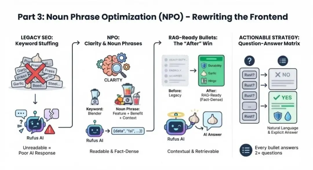 关键词堆砌的 Listing,会被 Rufus 惩罚(因为可读性差),现在要做名词短语优化——Rufus 识别的是 “功能 + 收益 + 场景” 的完整短语,而非单独关键词。简单来说,Rufus看标题,只抓前面一小段。