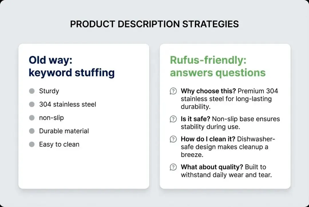 Rufus 在回答买家问题的时候,会直接提取你 Listing 五点描述里的内容,所以千万别再写 “坚固、耐用、好用” 这种空泛的话了。你要把买家最关心的问题直接写进去,比如为什么选这款产品、使用起来安不安全、操作方不方便、清不清晰、使用寿命长不长,把这些疑问一次性在五点里全部答清楚,AI 才会更愿意推荐你的商品。
