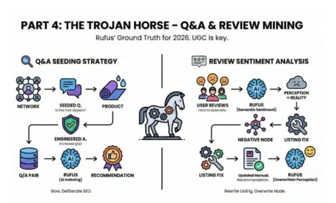 Rufus 更相信买家的 UGC 内容,而非卖家的自卖自夸,评论和问答是影响算法推荐的核心板块,也是无需改商品就能优化的关键抓手。简单来说,Rufus非常爱看Q&A,你提前把高频问题放上去,AI就觉得你这个产品信息全、靠谱。