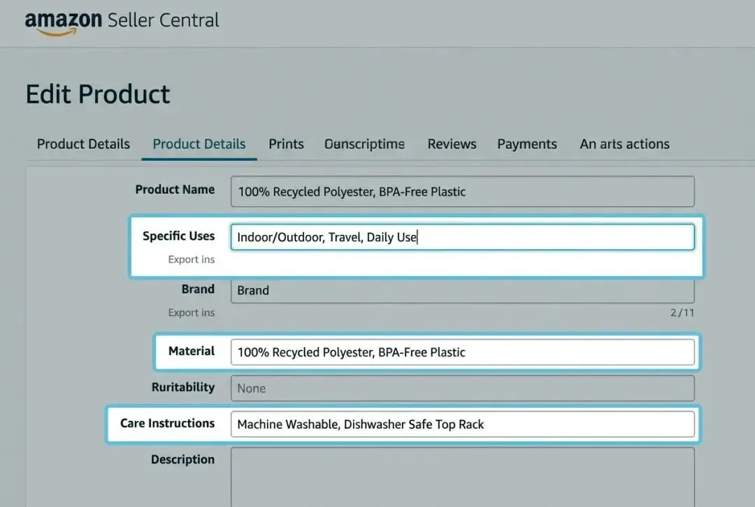 很多卖家都忽略了后台属性这一块,其实这恰恰是 Rufus 最看重的地方。材质、用途、适用场景、保养方法、各类认证信息等等,后台能填的一定要全部填满,信息越完整,AI 就越能精准识别你的产品;要是空着不填,AI 根本不会把你放进推荐池。