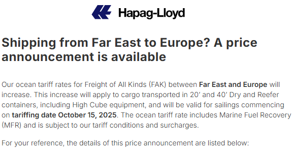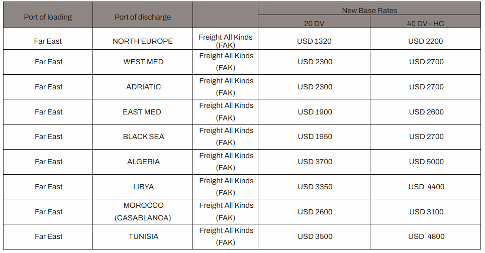 赫伯罗特公司宣布,将对远东-北欧航线引入新的FAK费率,每20英尺为1200美元,每40英尺为2000美元;对于远东-地中海航线,费率在2150美元至2700美元之间,具体价格取决于目的地。