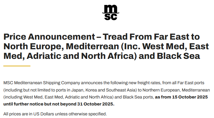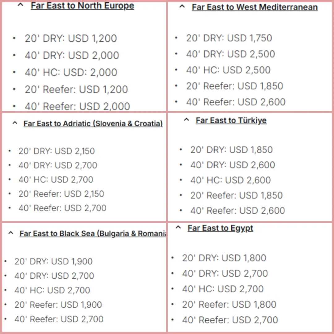 MSC也宣布了类似的新FAK费率水平,亚洲-北欧航线每20英尺为1320美元,每40英尺为2200美元;西地中海航线每20英尺为2300美元,每40英尺为2700美元。