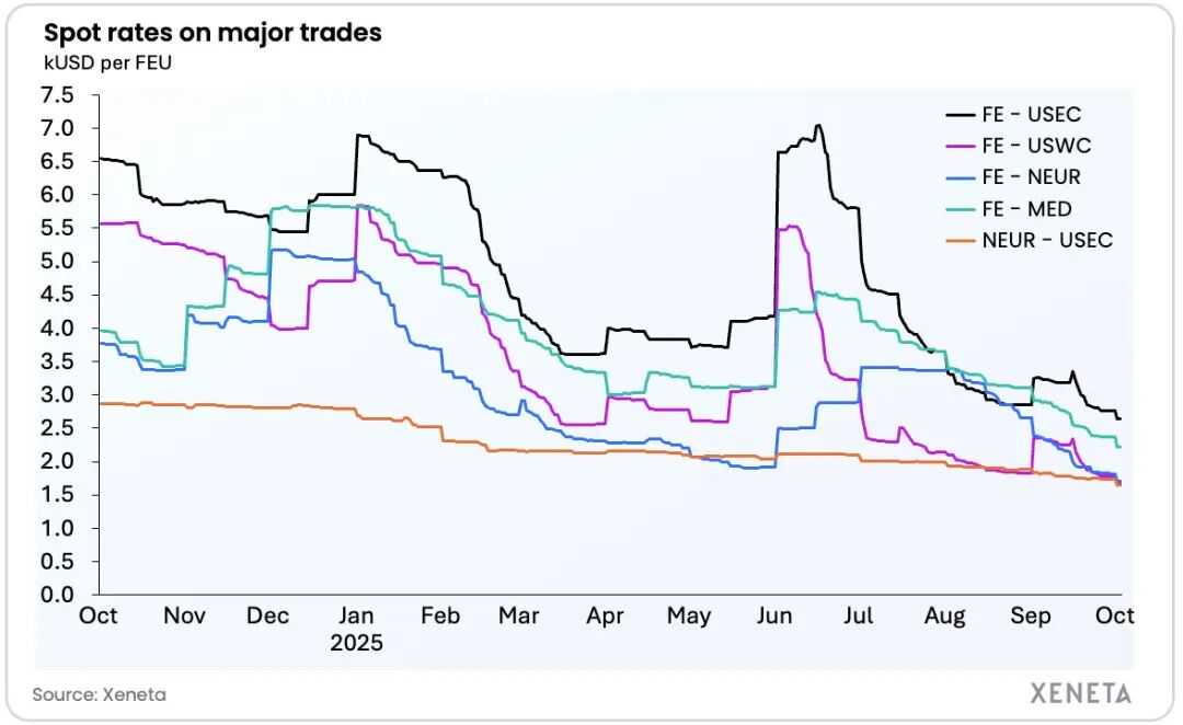 甚至通常较为稳定的跨大西洋贸易似乎也陷入了困境。本周,鹿特丹至纽约航线的WCI再次下跌1%,收于每40英尺1796美元。Xeneta指出,西行即期运费较8月底下跌10.2%,北欧至美国东海岸的运费目前处于21个月以来的最低点,也是自2023年底以来的最低点。
