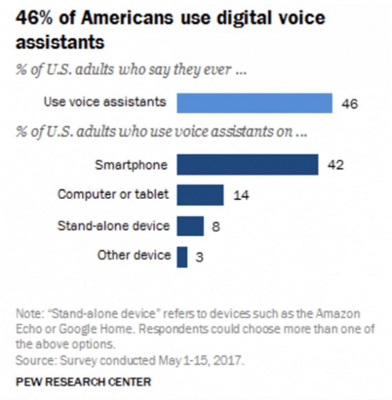根据调研机构Pew Research Center提供的数据,2017年全美使用语音助手系统进行购物的消费者占比已经达到了46%。因此,语音购物趋势将继续在今年的节假日大促中蔓延。相关分析认为语音应用和Alexa语音交互设备的发展将推动语音购物在今年的假日零售中贡献3%的订单量。