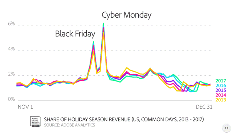根据Adobe Digital Insights的一份报告,黑五一天的销售额就占全美节假日零售总收入的4.6%。与此同时,网一的占比为6.1%。据数据预计,感恩节(11月22日)到12月1日(网络周一周末)期间的销售额将占假日零售总额的37%。