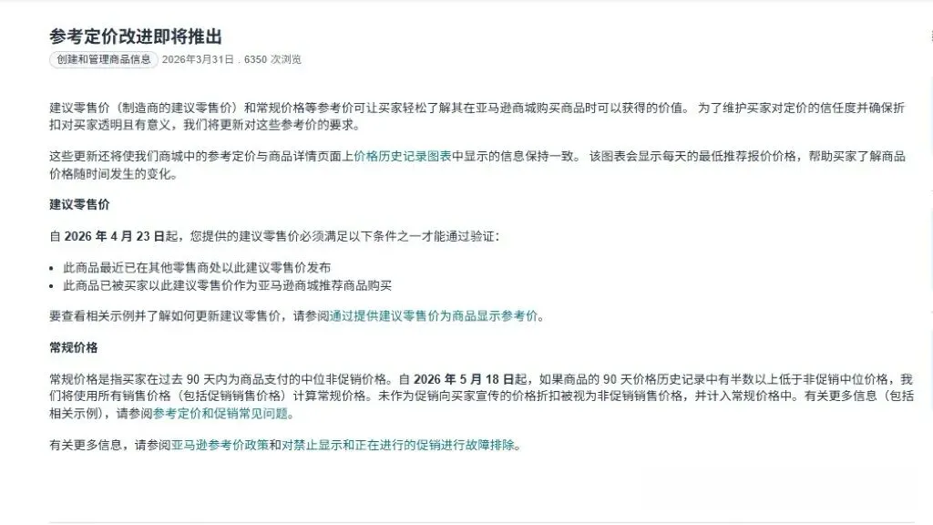 亚马逊官方发公告,宣布将在今年4月23日和5月18日分两步,正式收紧 List Price(建议零售价/划线价)和 Typical Price(常规价,也叫 Was Price)的抓取规则。白话说,就是以后想在详情页给消费者看到一个漂亮的折扣,规矩比以前严多了。