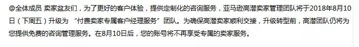 其实早就听一些内部人士说,亚马逊将会取消免费的客户经理对接,未来将采取收费制度,给付费的卖家提供服务,比如报BD、店铺绩效咨询等,就是不知道什么时候开始全方面推广,以及收费和合作形式。