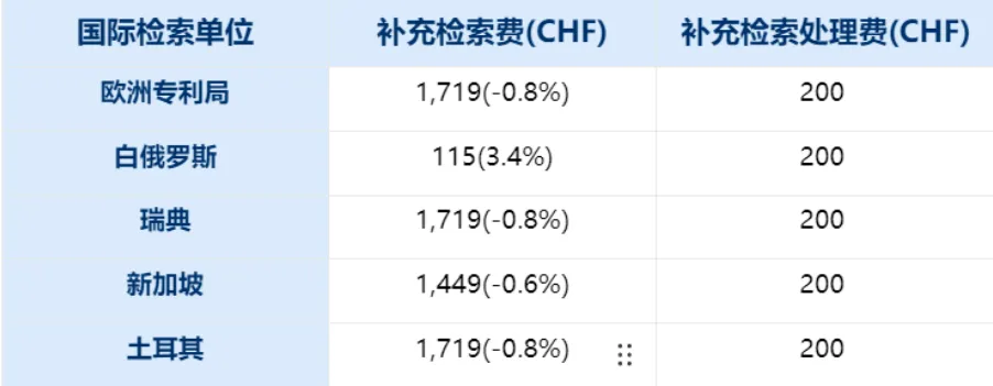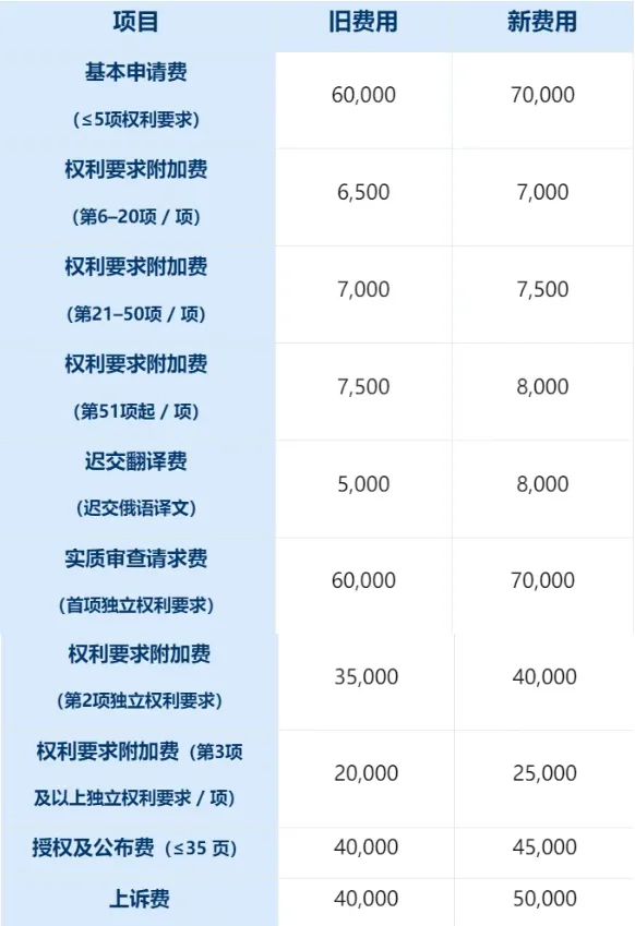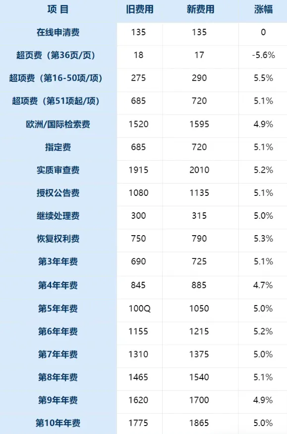 本次官费上调平均涨幅约为5% - 8%,覆盖EPO专利申请全周期,以下为部分项目费用调整情况(单位:欧元):