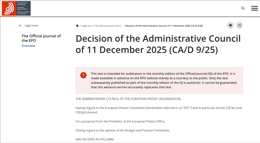 网址:https://www.epo.org/en/legal/official-journal/decision-administrative-council-11-december-2025