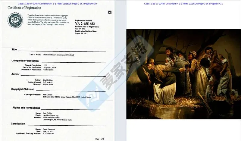本案是keith律所代理美国著名艺术家Paul Collins发起的版权维权案件,涉案版权号为:VA 2-455-683,一幅著名的Harriet Tubman的地下铁路作品,该作品于2025年6月19日获得美国版权认证,未经授权使用则会面临TRO冻结风险!目前本案涉及的53店,账户资金暂未被TRO冻结,需要名单的卖家可联系我们获取,并可加入keith律所专属群聊,实时掌握keith律所最新动态,精准避雷!